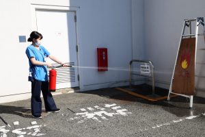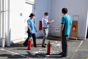 練習用の水消火器を使い、消火器の使い方を学ぶ